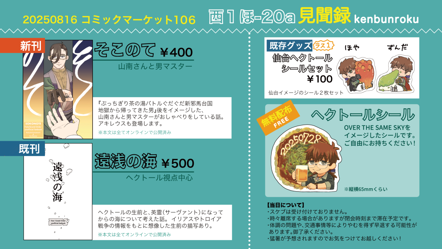 夏コミのお品書きです。16日土曜日(1日目)、西1ホールほ-20a『見聞録』で参加します。
